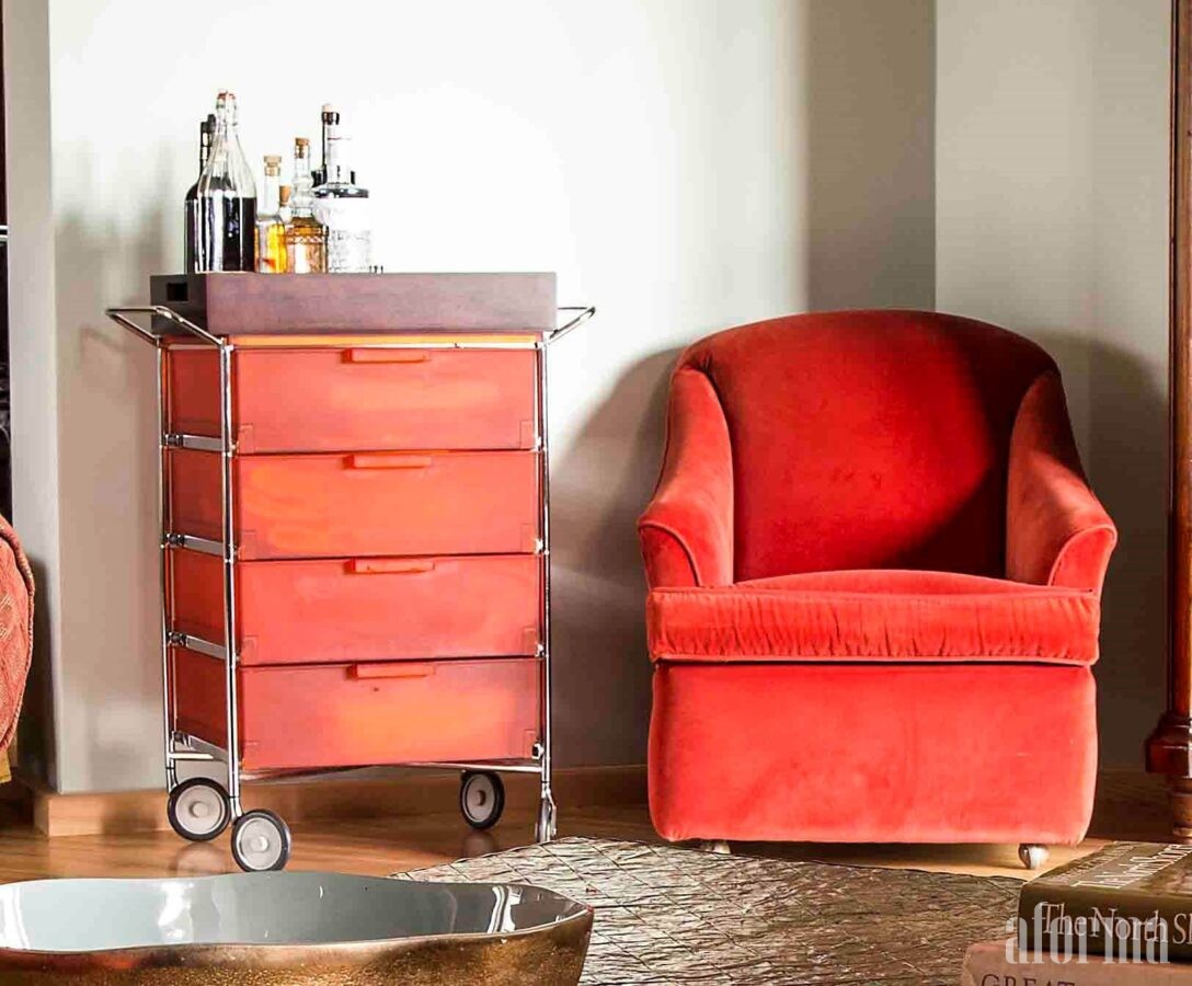 Eklektyczny i kolorowy apartament na warszawskim Powiślu. Z tarasu rozcIąga się piękny widok na panoramę Warszawy
